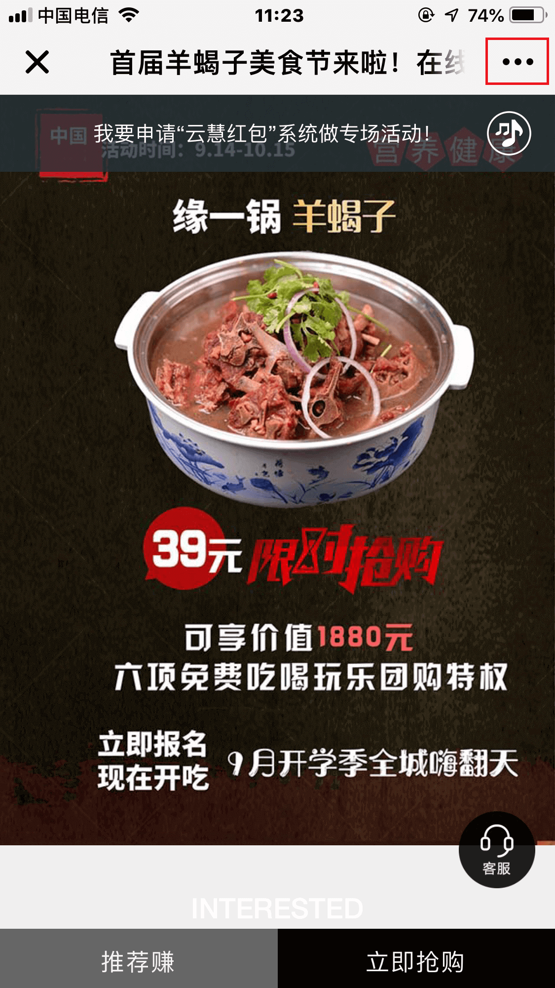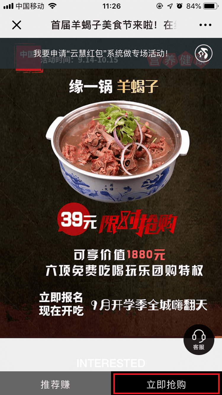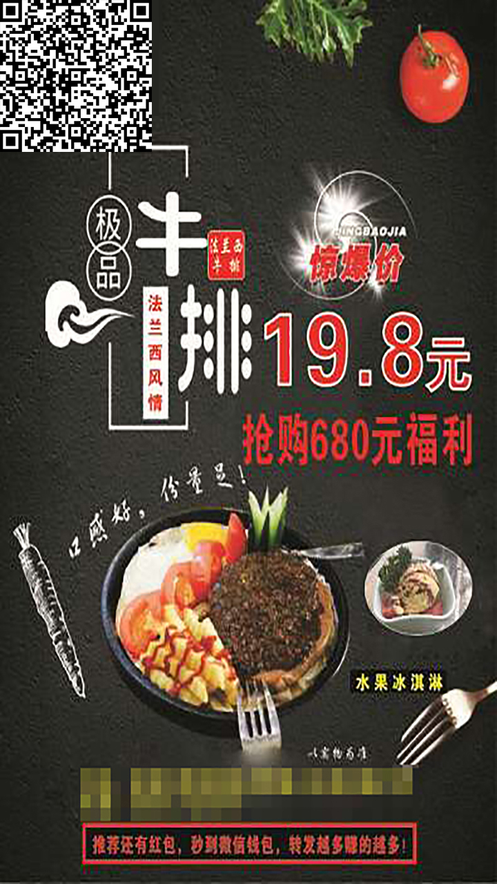 商家通过爆款套餐开展线上订购活动,消费者仅需花费很少的费用即可获得套餐优惠,并且推荐好友参与可以获得高额红包,推荐多人参与活动,所获得的红包金额可以大于等于自己参与活动支付的金额,推荐的越多赚的越多,并且红包是实时到账户用户的微信零钱,刺激用户积极主动去帮助商家推广活动,商家仅需在自己门店给老用户讲解活动,即可将活动裂变出去,省去了大量的广告费用,而用户到店消费,或多或少会增加菜品,使商家获得盈利,而且通过体验式消费可以挖掘大量的潜在客户,后期到店消费。
